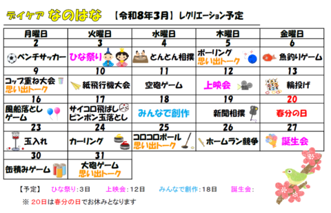 3月のデイケア予定表
