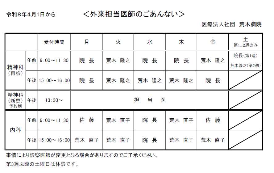令和8年4月1日より、外来担当医師の診療時間帯が一部変更となります。